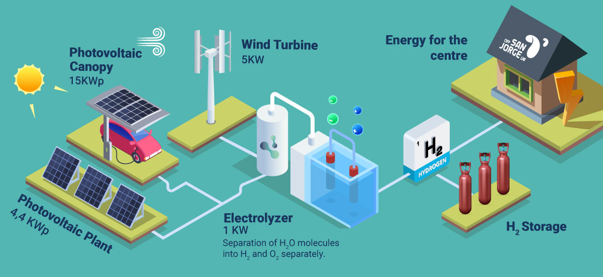 Green hydrogen will be generated using a 1 kW electrolyzer powered by a 5 kWp vertical-axis wind turbine, a 4.4 kWp two-axis solar tracker photovoltaic installation, and a 15 kWp photovoltaic solar canopy with three 22 kW electric vehicle charging points.