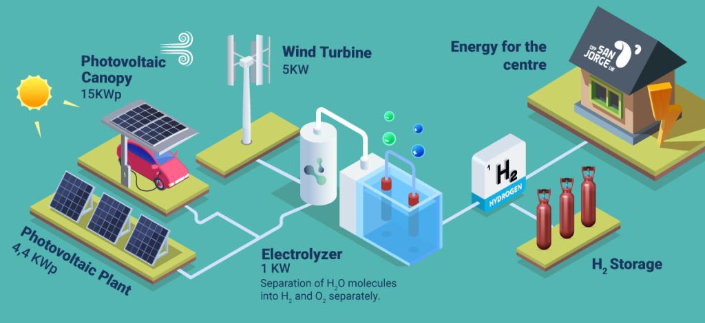The facility combines the necessary technology and installations to obtain pure hydrogen from water, using the photovoltaic and wind equipment of the centre as the energy source for this process.
