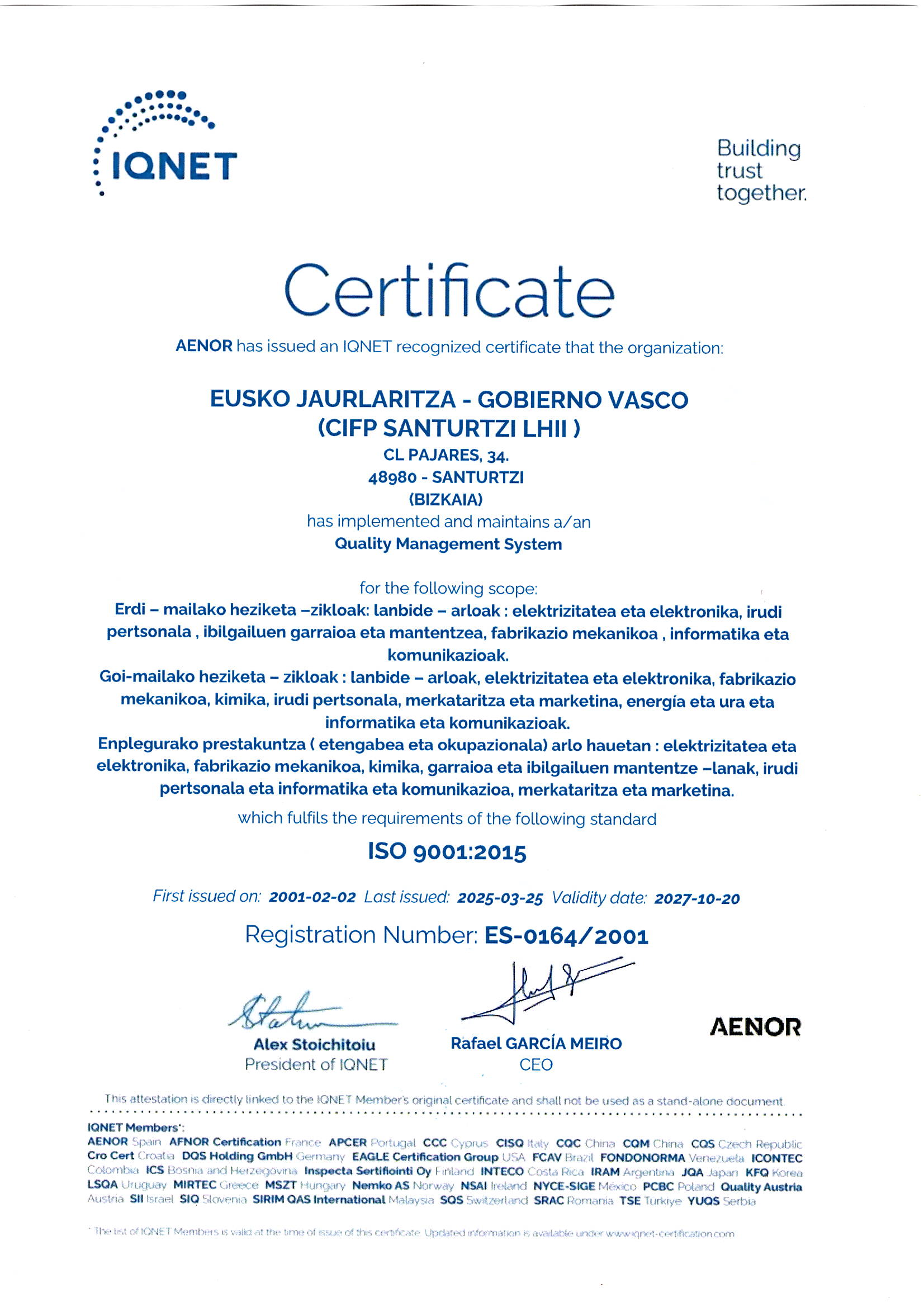 FP Santurtzi apostó desde sus inicios por la excelencia en la gestión, ya que entendíamos que ésta incidía directamente en la formación de nuestro alumnado y mejoraba la relación con todas las partes interesadas (familias, docentes, empresas,…). Un esfuerzo que se ha visto recompensado por las certificaciones obtenidas.